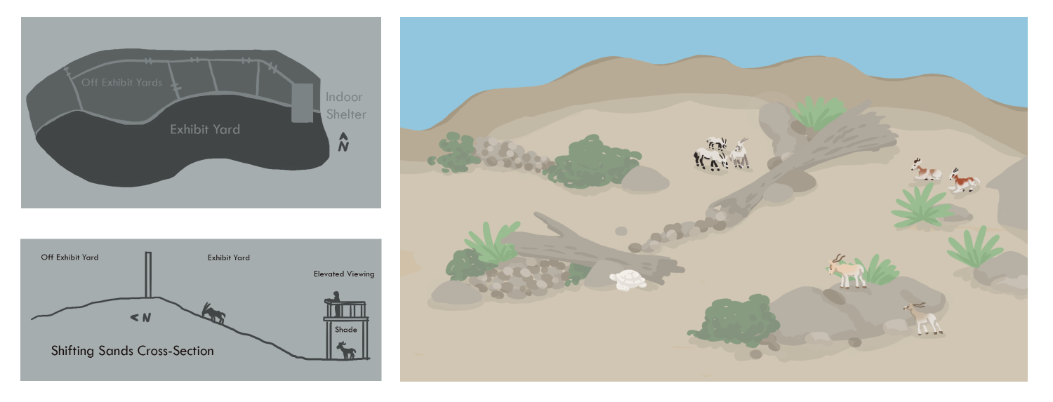 Shifting Sands is a long, sloping exhibit featuring Dama Gazelle, Arabian Oryx, Addax, and African Spur-Thigh Tortoises. The sprawling space is broken up with terraces, brush, logs and rocks to create both variations in terrain for exersize and enrichment and for visual barriers to minimize stress. The substrate is deep enough to allow natural burrows to be dug by the tortoises for temperature and moisture regulation. Spacious yards off exhibit allows the animals to be seperated from guests and from each other for quarantine, health or social reasons.