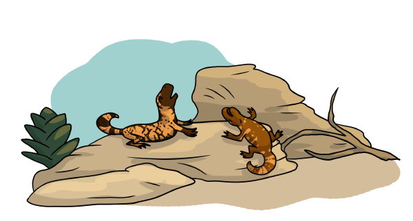 With no shortage of food, the gila monsters have little to squabble over except the best basking rock. Beanbag responds to every challenge (or mild stressor of any kind) by flopping over, so Morticia is always the defacto winner.